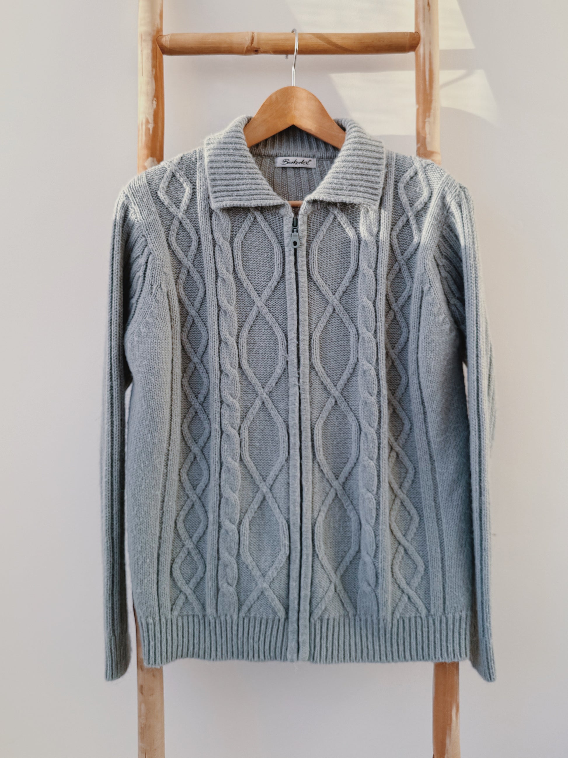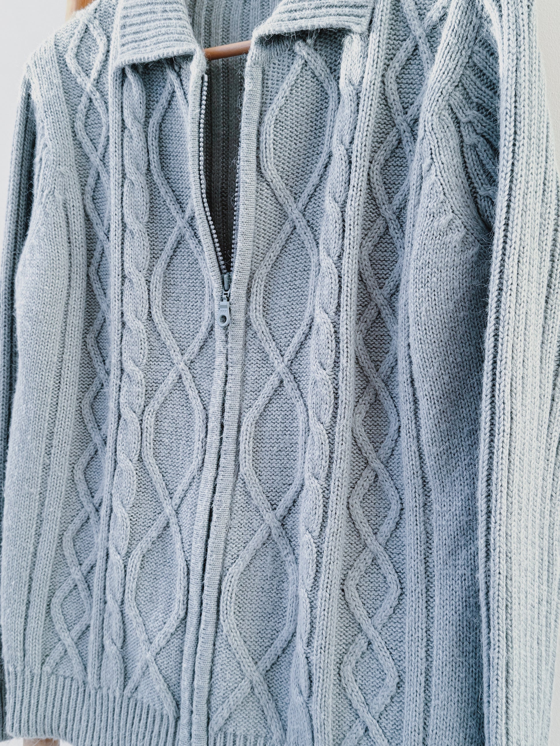Vintage bluey/grey knit zip up. Label size 14-16, could work for a size 12 too. Soft and great vintage condition. Would look great with jeans and a white tee.