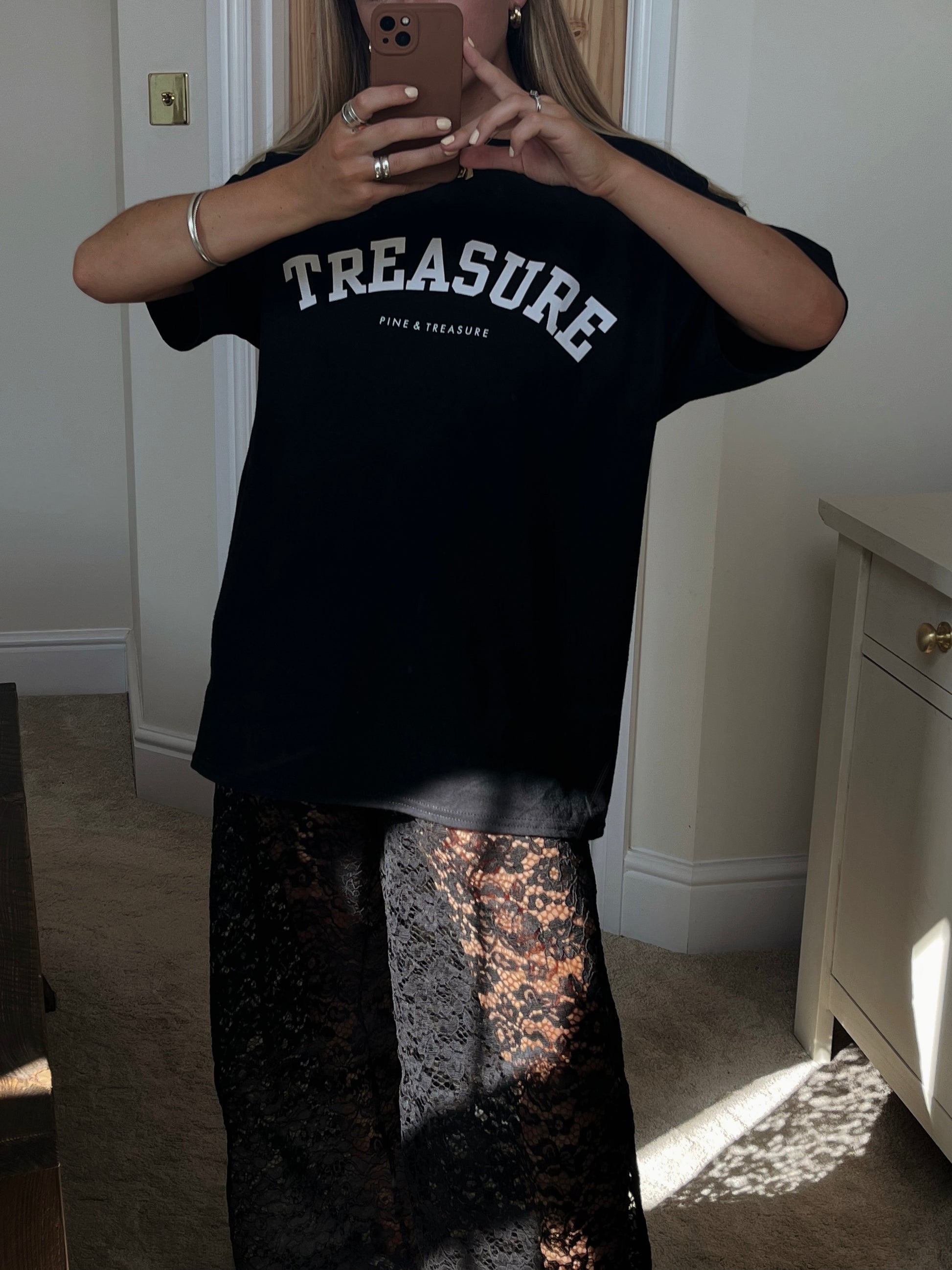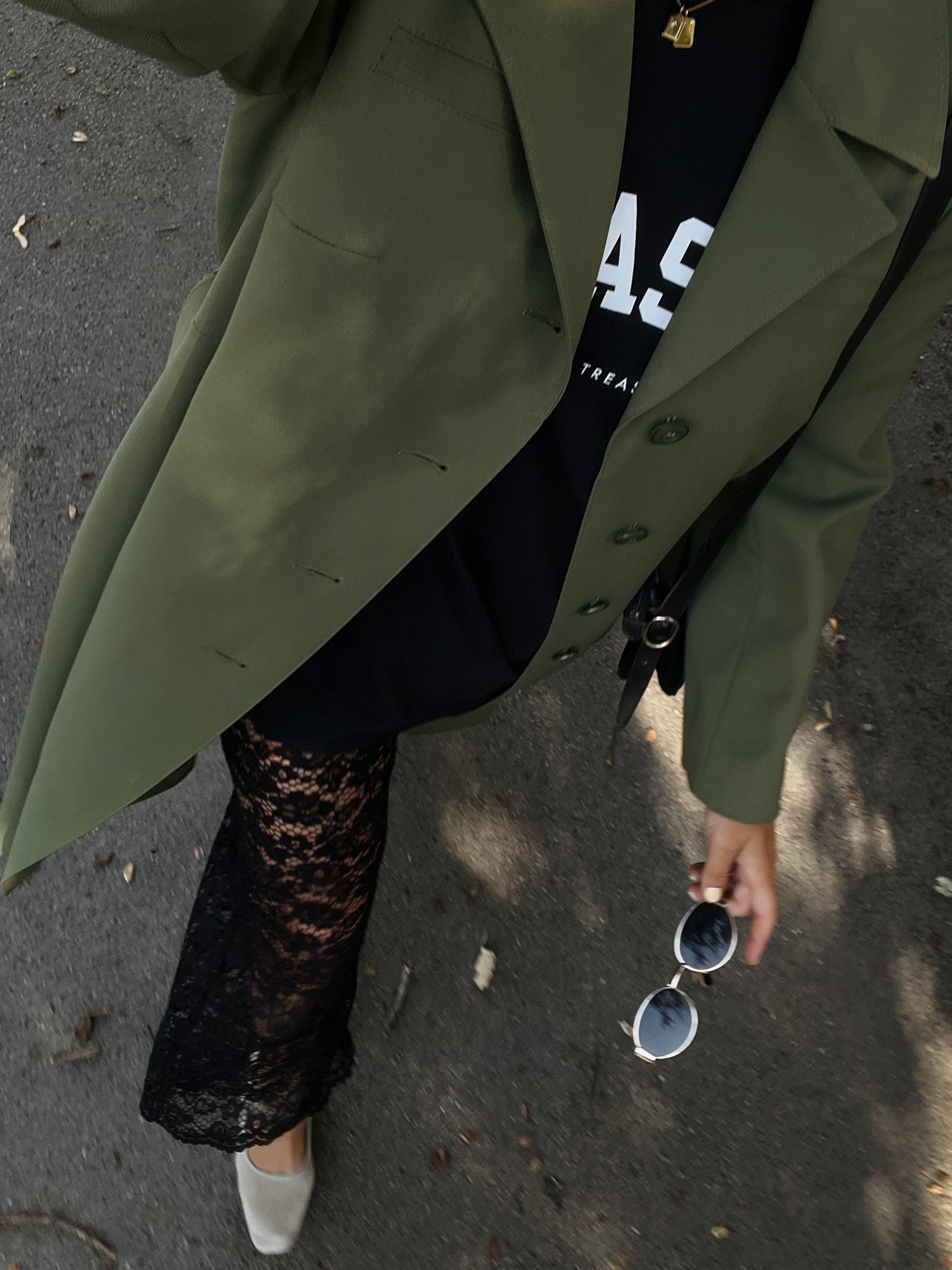 Pair the trousers with an oversized tee and the tie tops with a base layer like leggings for a more casual look, or wear the lace pieces together, with a blazer and heels for a party vibe.
