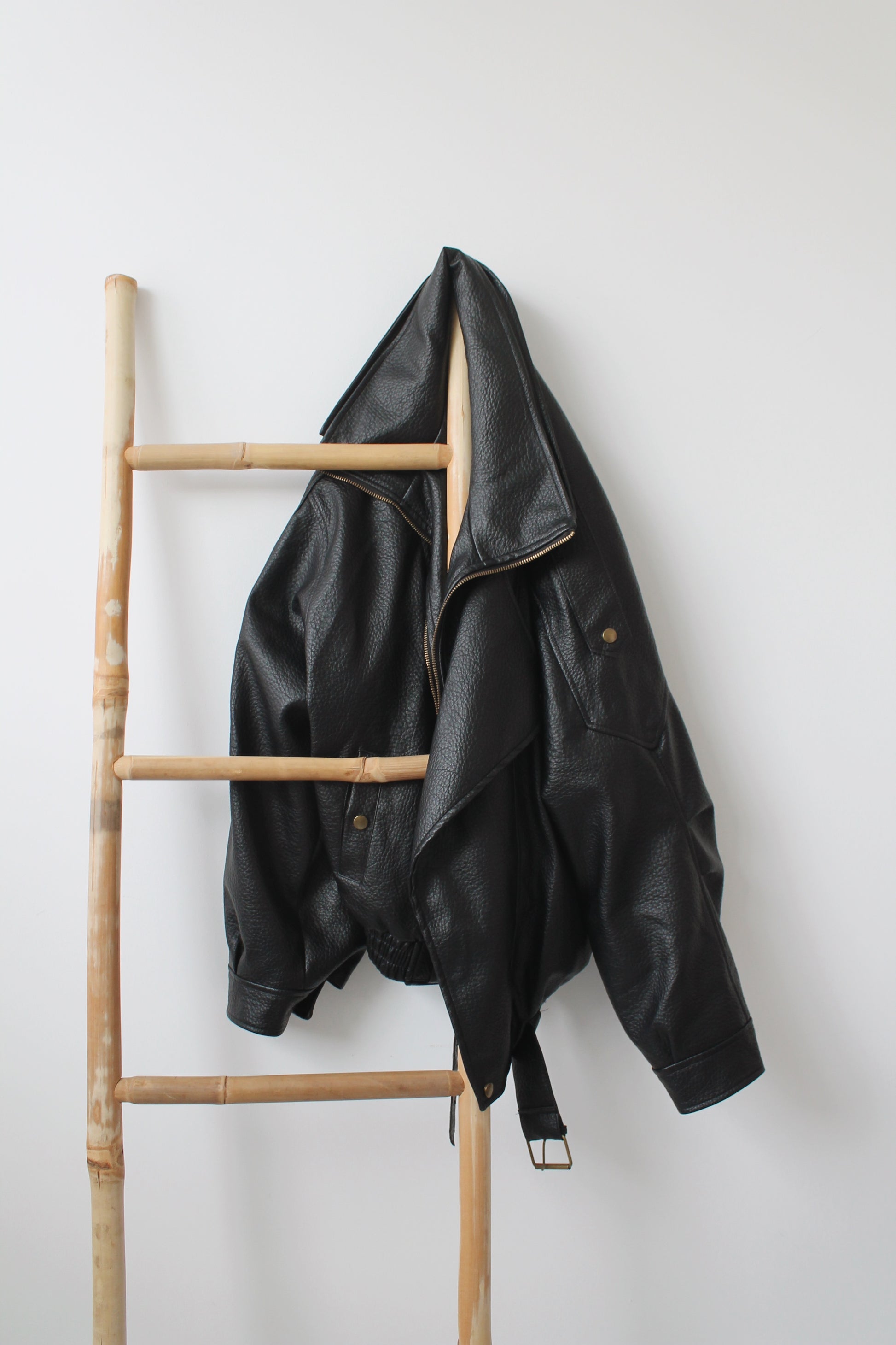 Leather bomber jacket with elasticated waistband and buckle feature. Mid-weight, soft. Unbranded but Japanese care labels.