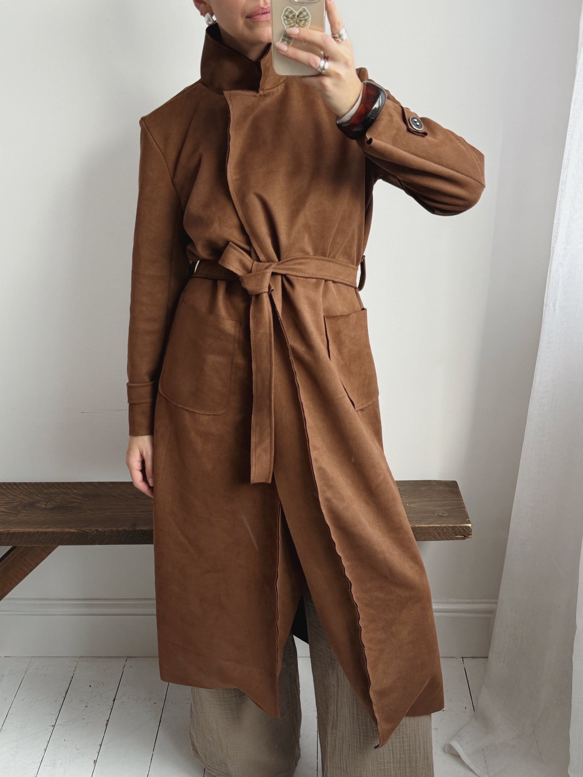 Beautiful chocolate brown lightweight faux suede trench coat. Could suit between sizes 8-12. Tie belt. One cracked button on sleeve. Barely noticeable.