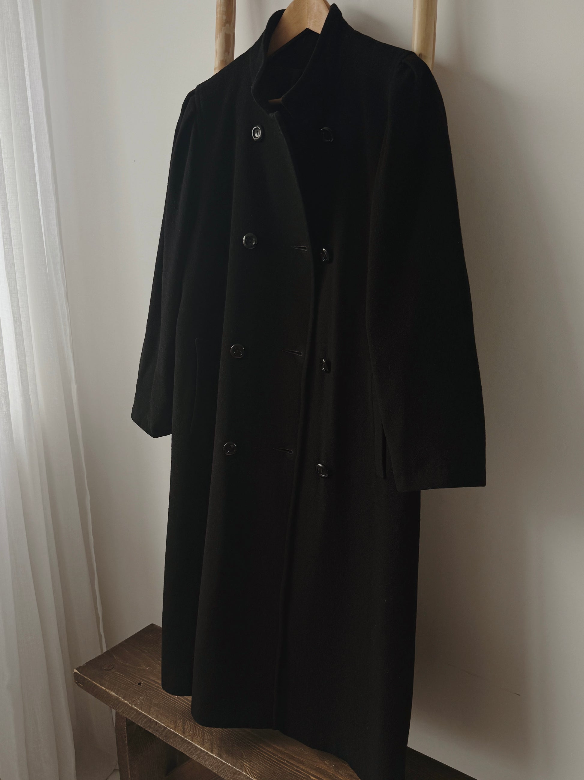 A stunning black pure new wool coat in fantastic vintage condition. Label size 12, but could easily suit up to size 16. Would be oversized for a 12. Wide structured shoulders and a beautiful double breasted front. A smart silhouette and a piece that will last a lifetime.