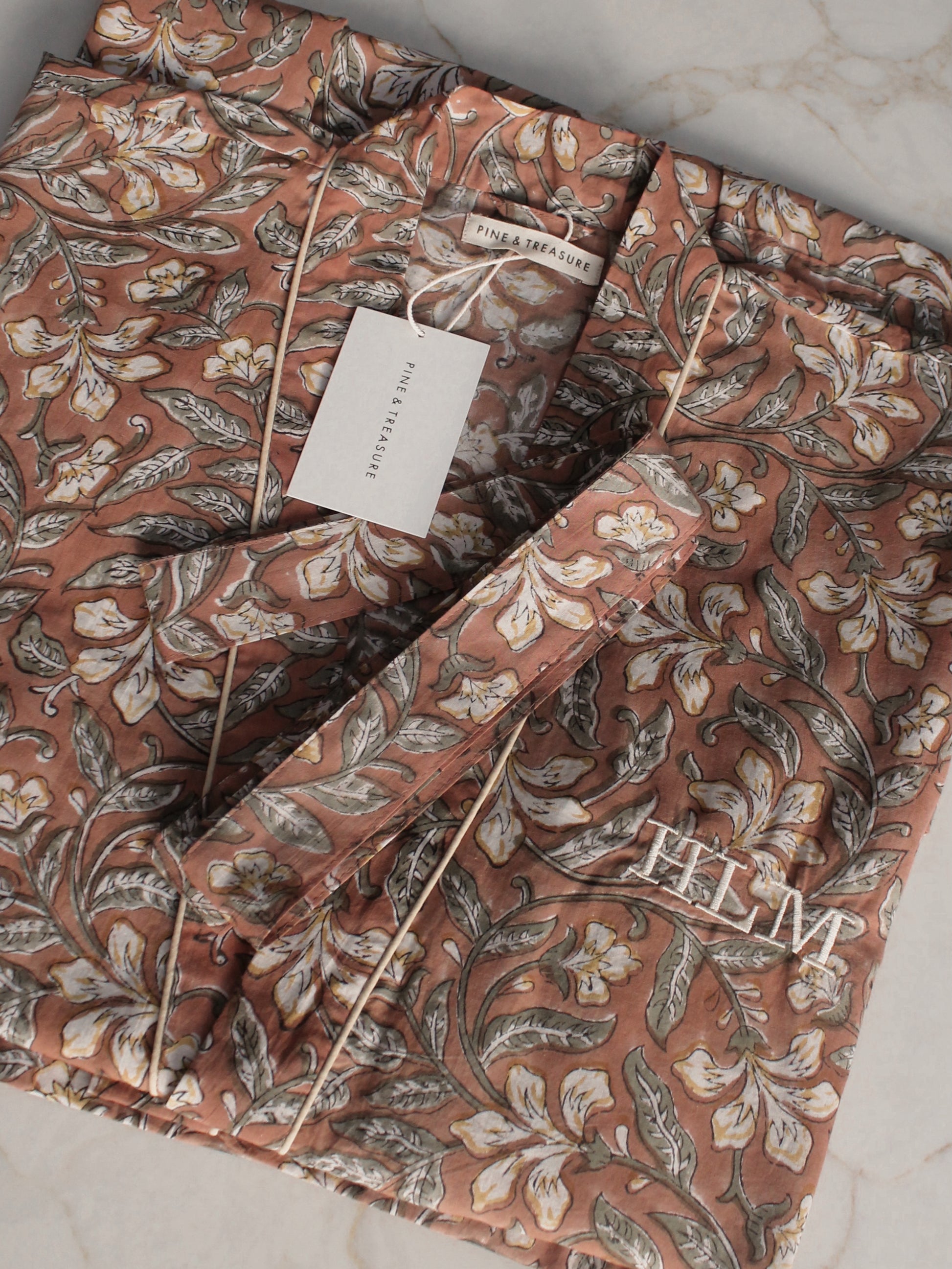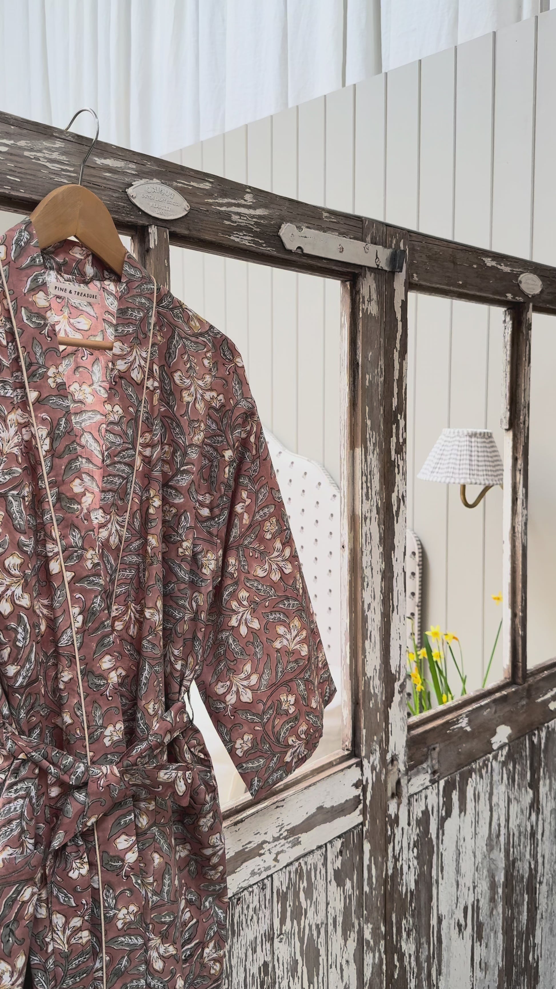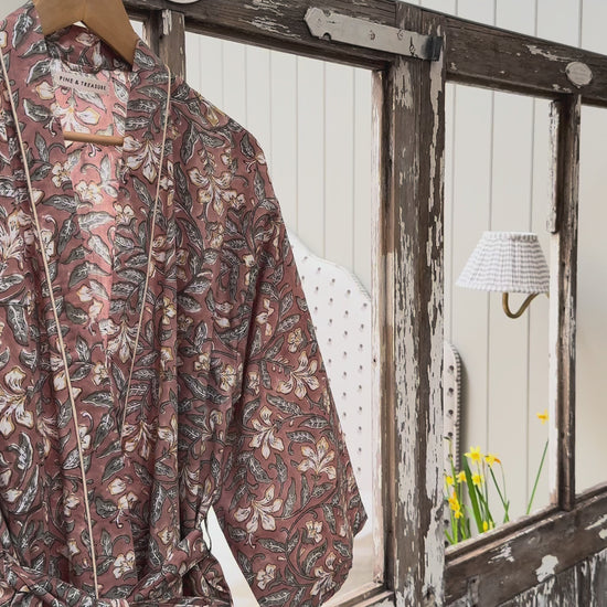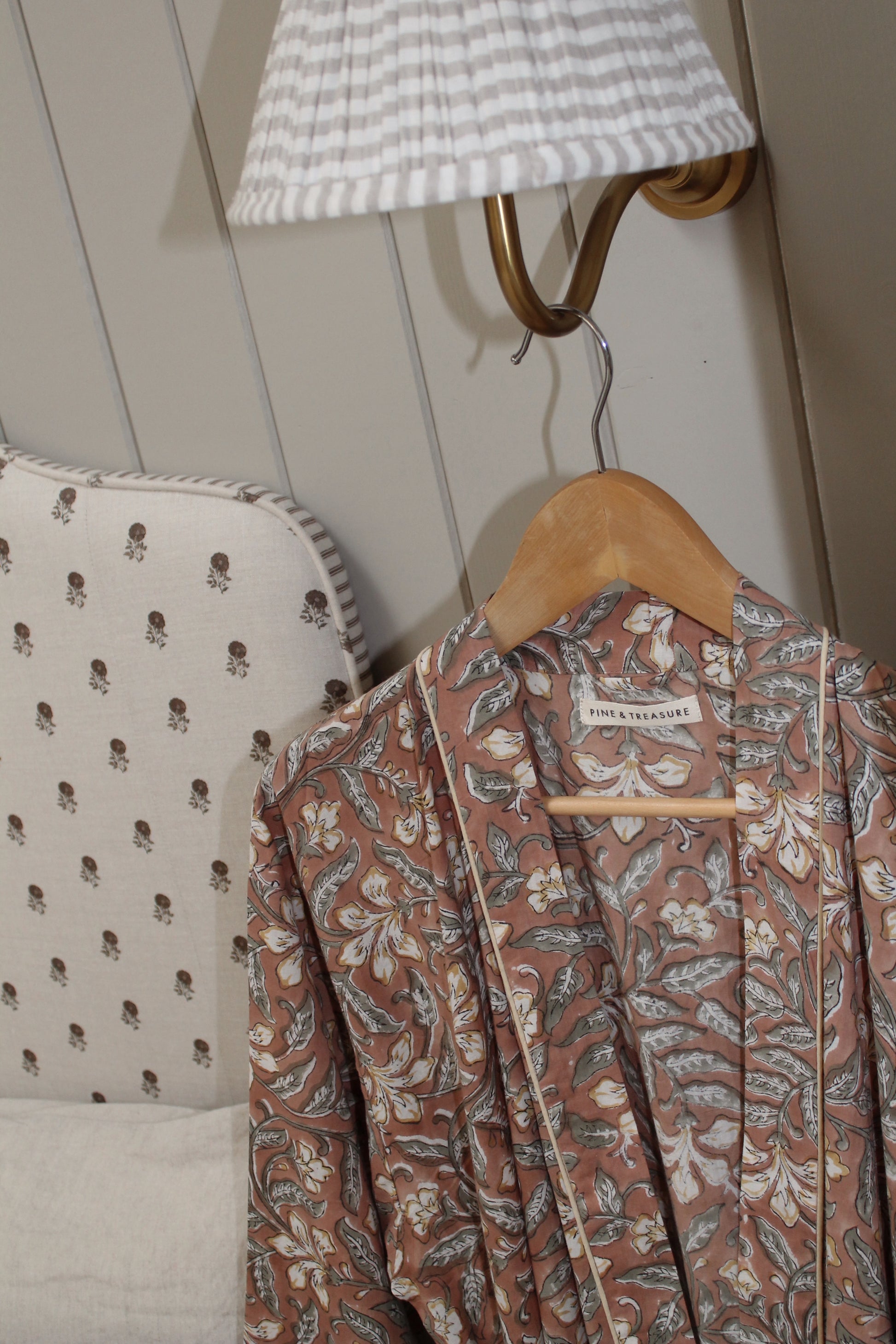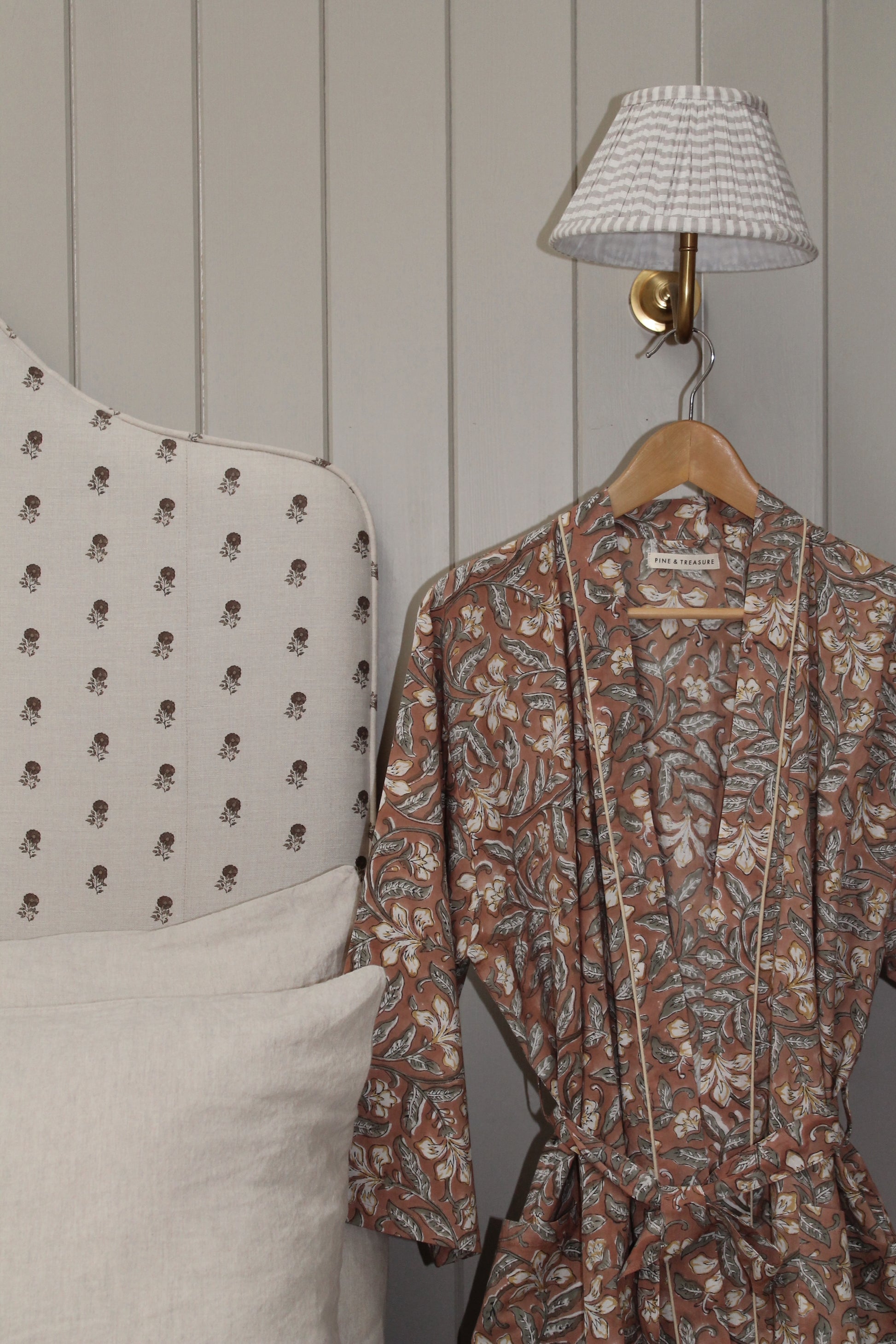 From the hand-block print of the material, to the very last-sewn seam, please know your robe is the work of caring hands. They aren’t mass-produced, each one carries its own story of small and ethical business. They are proudly made by a small, talented team in Jaipur with artisan history and traditional block printing roots. This is what makes these robes feel all the more special.