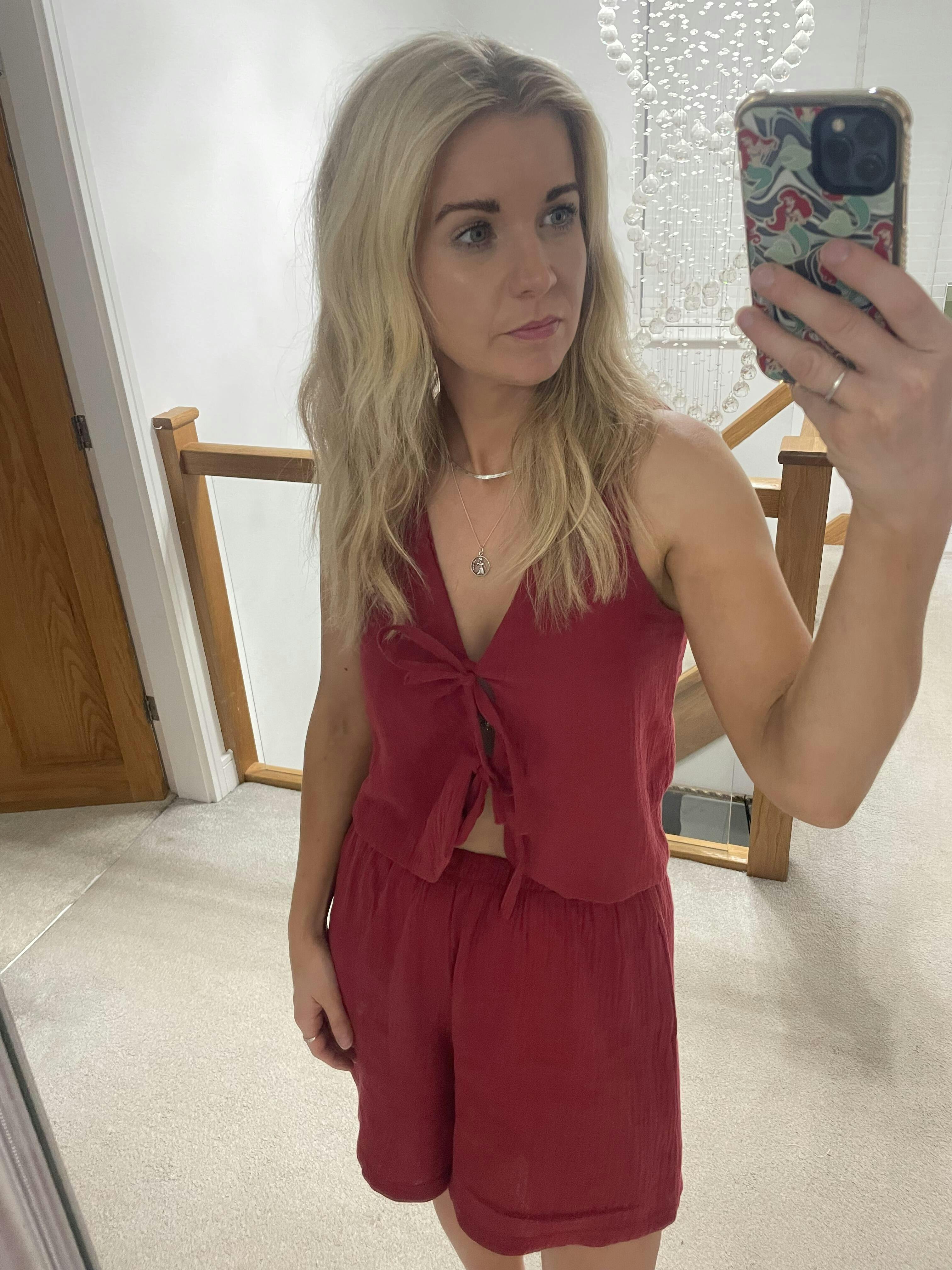 The waist measurements have been taken with the shorts laid flat, measuring across the waistband from left to right. Please note these are high waisted shorts. Katie is a UK size 8-10 and wears the S shorts.