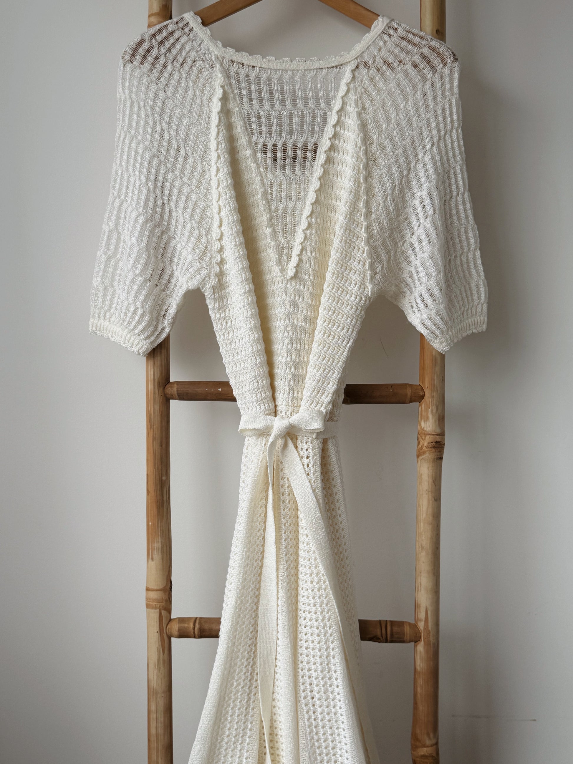 Stunning vintage ivory crochet knit dress. Elegant design with draping sleeves, a covered chest and scoop back. Waist tie which can be tied to the back or front to cinch as desired. Immaculate vintage condition. Could be beautiful for a casual bridal look. Equally a great piece for layering with tights and boots in colder weather.