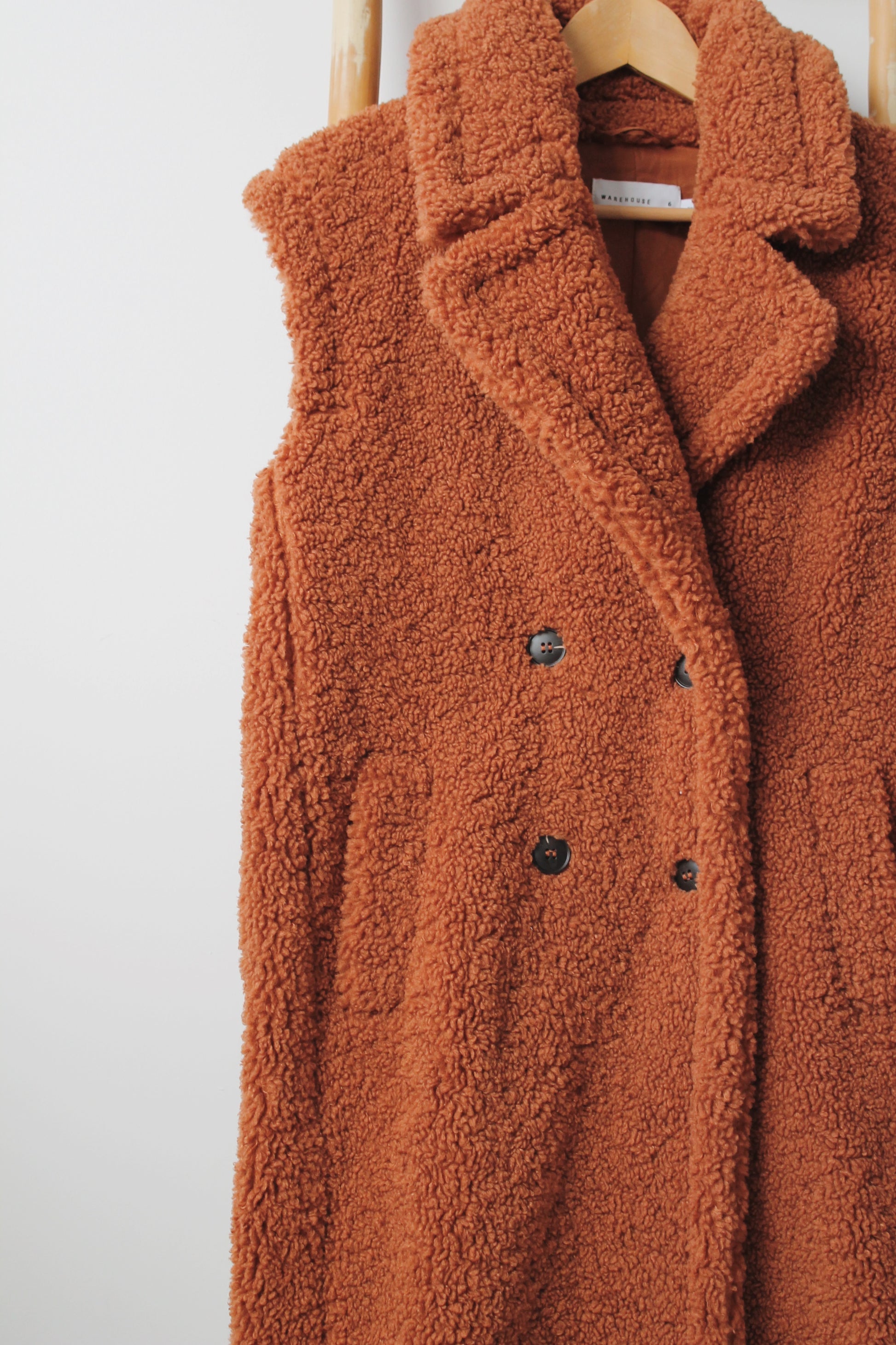 A super snuggly fleece-like long gilet in a beautiful burnt orange, perfect for autumn!