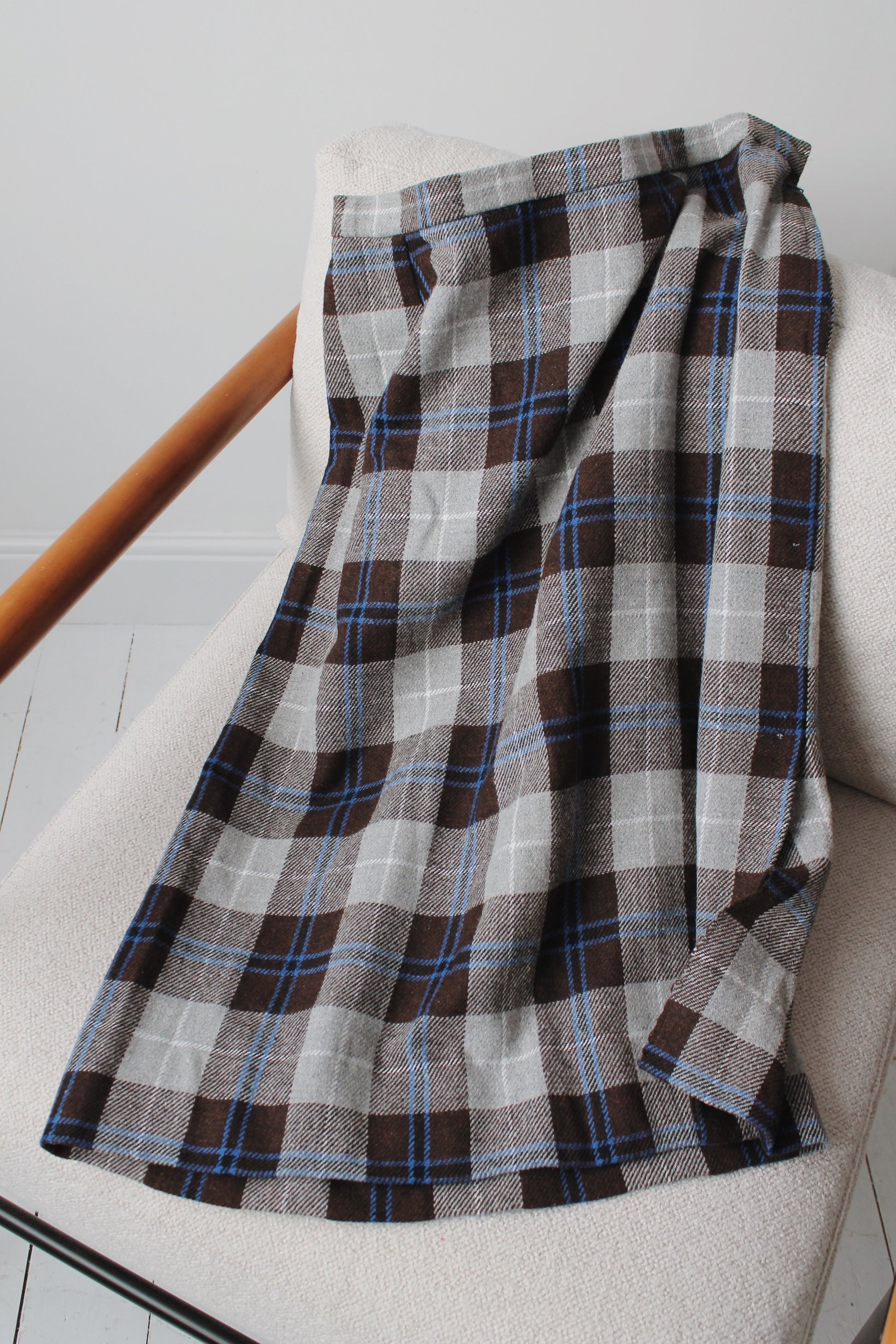 Blue tones and chocolate brown hue check skirt. No labels inside, possible homemade. Size XL/18. Feels like wool.